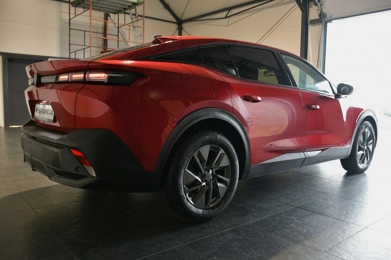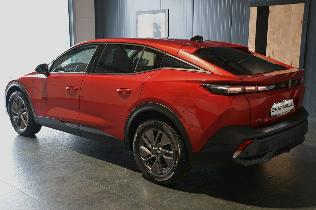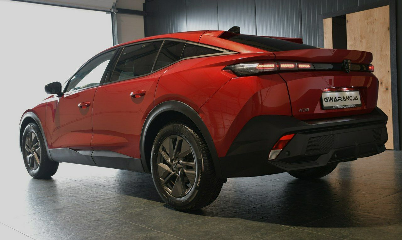 Samochód prezentuje się niezwykle efektownie w kolorze Elixir Red – to głęboki, perłowy odcień czerwieni, który znakomicie podkreśla ostre linie nadwozia i dynamiczną sylwetkę 408.